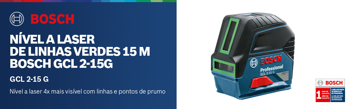 O Nível a Laser Verde 15 m Bosch GCL 2-15 G é 4x mais visível e traz linhas e pontos de prumo, que são ideias para o alinhamento perfeito entre um ponto no teto e outro no chão. Também conta com suporte magnético rotativo, trava de pêndulo e auto nivelação. Tem ainda versatilidade na fixação, já que tem entrada para tripé 1/4” e 5/8”. Faça nivelações verticais e horizontais, ainda sem riscar a parede graças às linhas de laser.